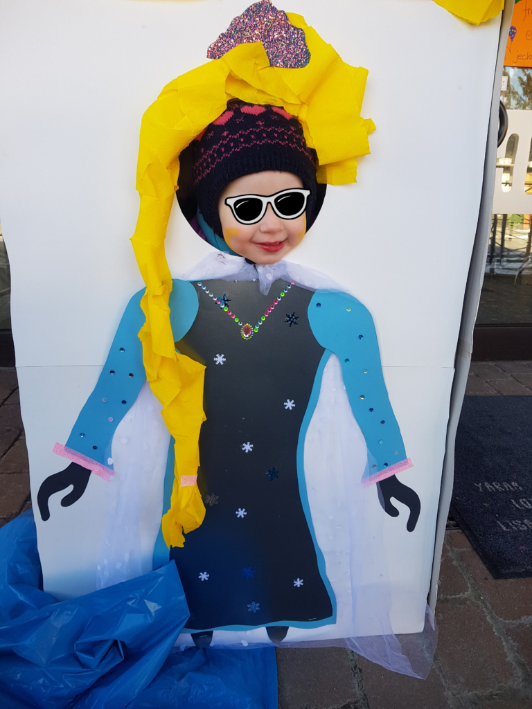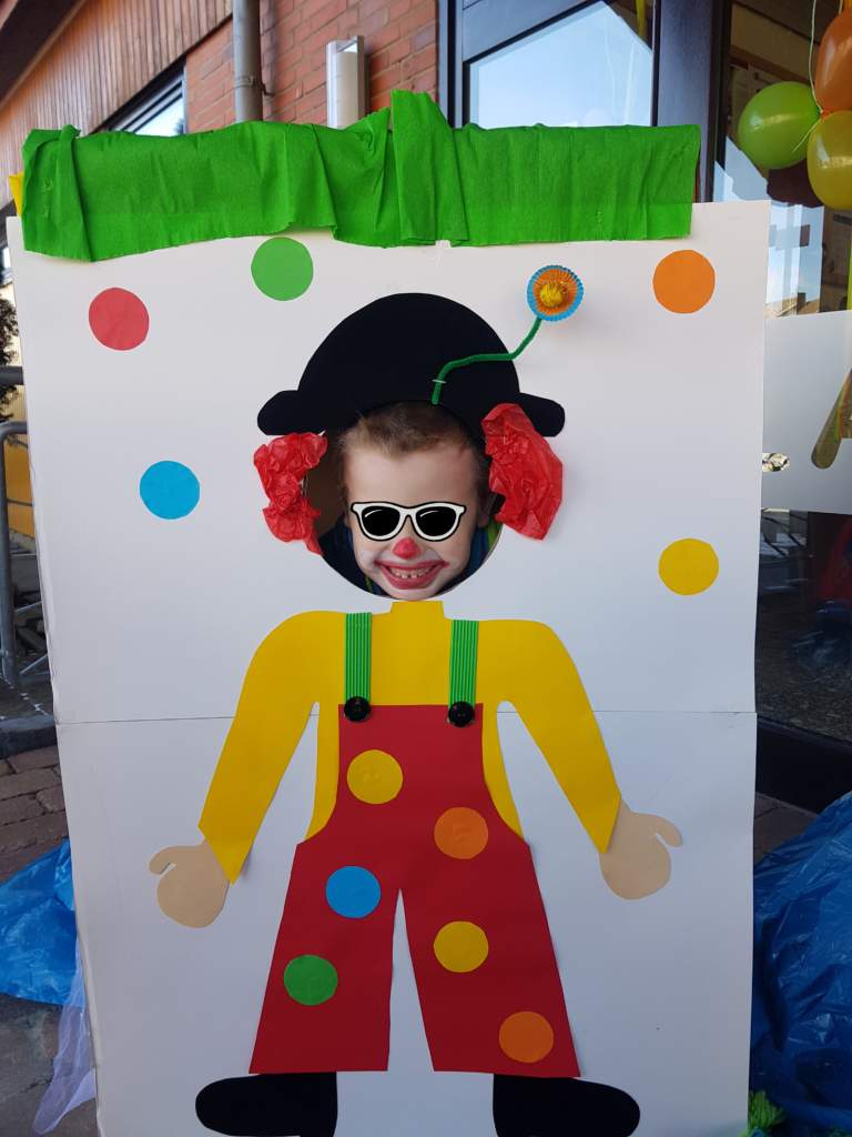 Jetzt für Karneval haben sie sich auch was ganz Tolles einfallen lassen. Hier gab es ein „Alaaf-to-go“! Das sah so aus: Vor dem überdachten Haupteingang des KiGas wurden Luftballons aufgehängt, es war ein bisschen bunt geschmückt, und es gab eine selbstgebastelte Fotobox, wo die Kinder sich aussuchen konnten, ob sie lieber als Clown, Prinzessin, oder Superheld fotografiert werden wollen.